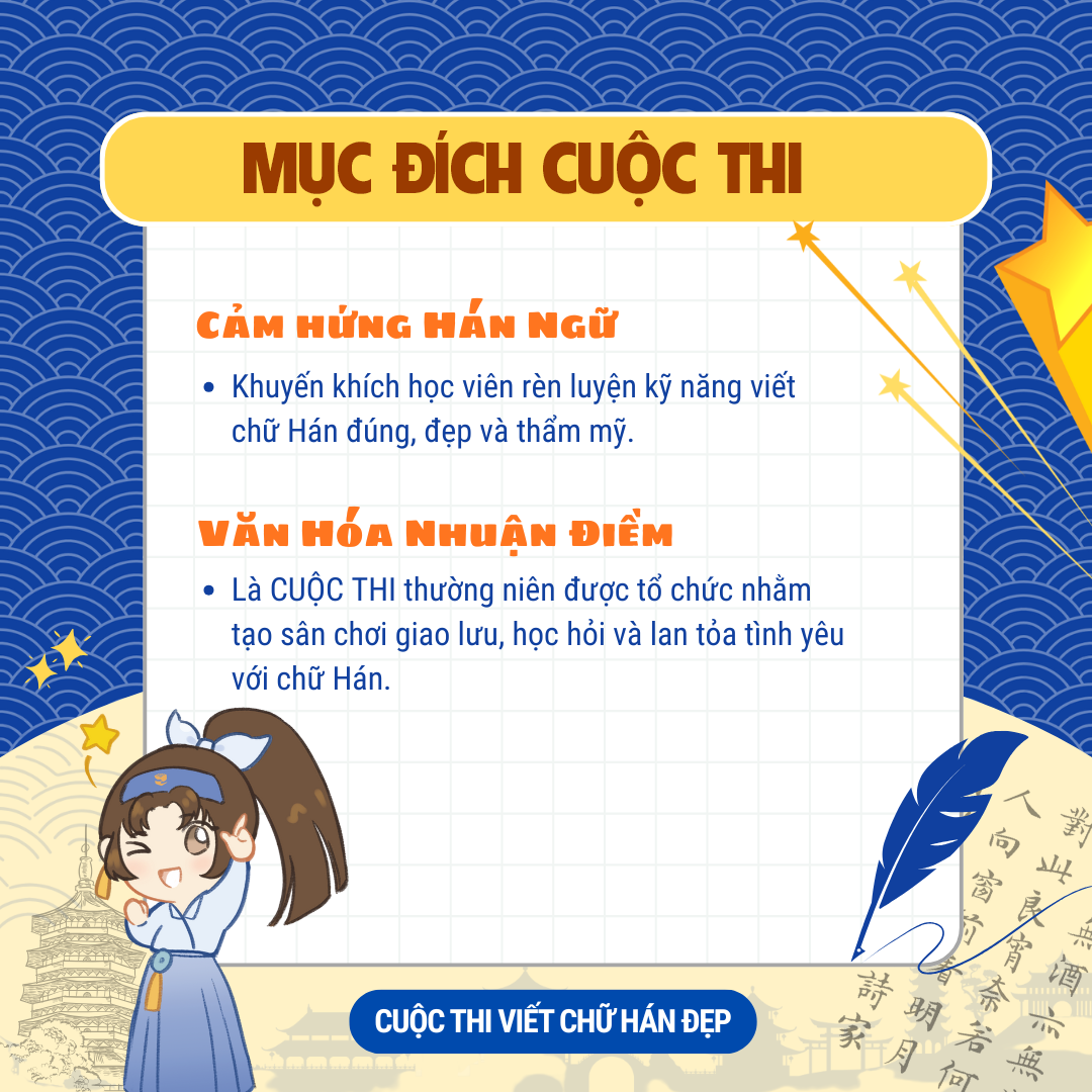 Cuộc thi được triển khai với hai mục đích chính. Trước tiên, đây là cơ hội giúp học viên rèn luyện kỹ năng viết chữ Hán sao cho đúng cấu trúc, chuẩn nét, đẹp về hình thức. Trong bối cảnh hiện nay, rất nhiều người học tiếng Trung tập trung vào nghe, nói mà chưa dành đủ thời gian cho kỹ năng viết. Vì vậy, cuộc thi này được thiết kế để nhắc nhớ tầm quan trọng của việc viết chữ một cách chính xác và khoa học.