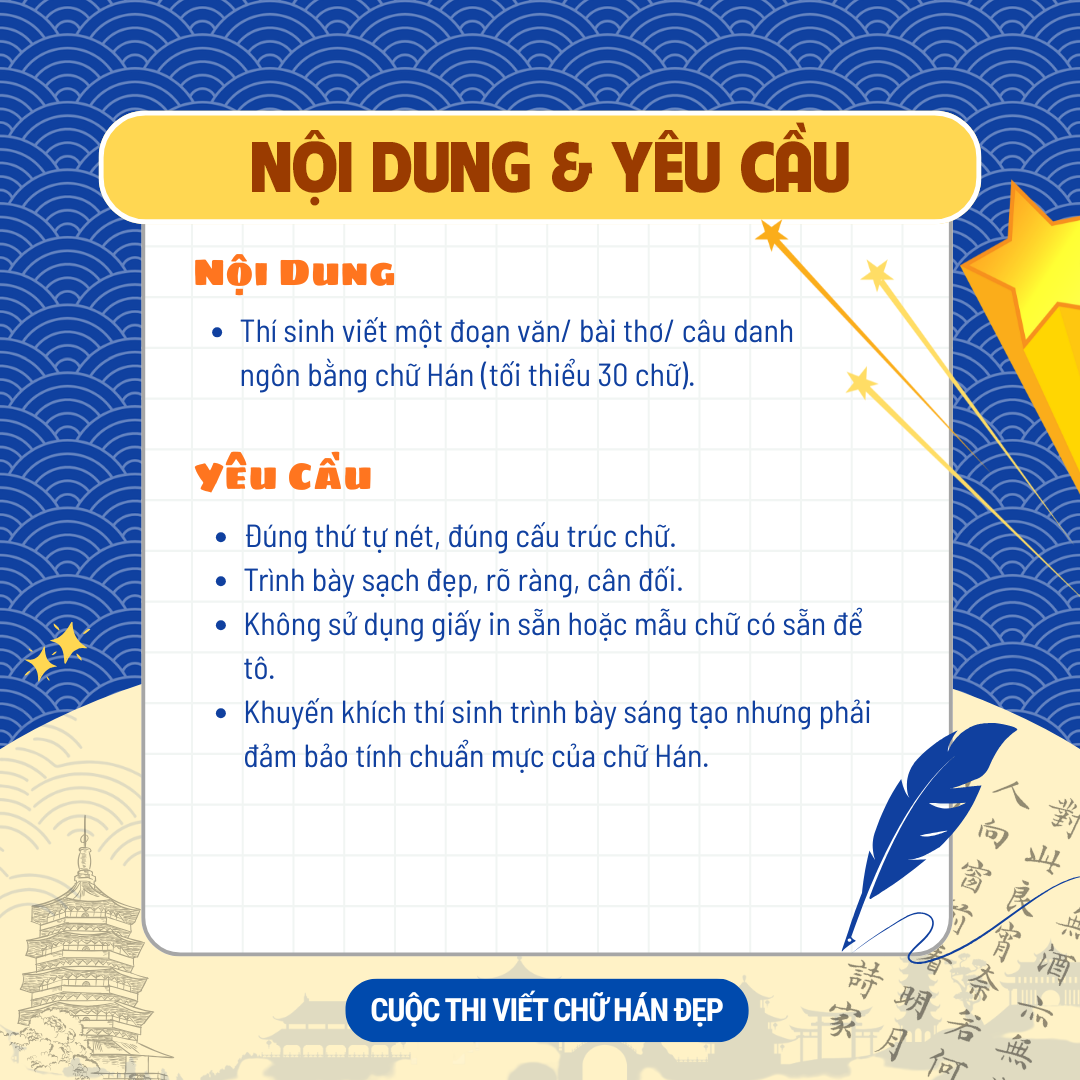Để phù hợp với tinh thần của cuộc thi, mỗi thí sinh cần viết một đoạn văn, bài thơ hoặc câu danh ngôn bằng chữ Hán, với số lượng tối thiểu ba mươi chữ. Đây là dung lượng vừa đủ để thí sinh thể hiện trọn vẹn kỹ năng trình bày, bố cục và khả năng kiểm soát nét bút.