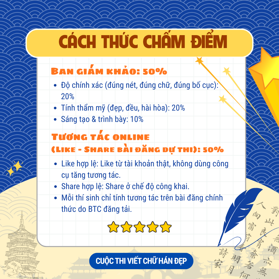 Cuộc thi “Nét Bút Vàng – Viết Chữ Hán Đẹp 2025” là cơ hội tuyệt vời để mỗi học viên tại Nhuận Điềm thể hiện bản thân, lan tỏa tình yêu với chữ Hán và khẳng định sự nỗ lực trong quá trình học tập. Đây là sân chơi bổ ích, lành mạnh và giàu tính nghệ thuật mà bất kỳ học viên nào cũng nên thử một lần.