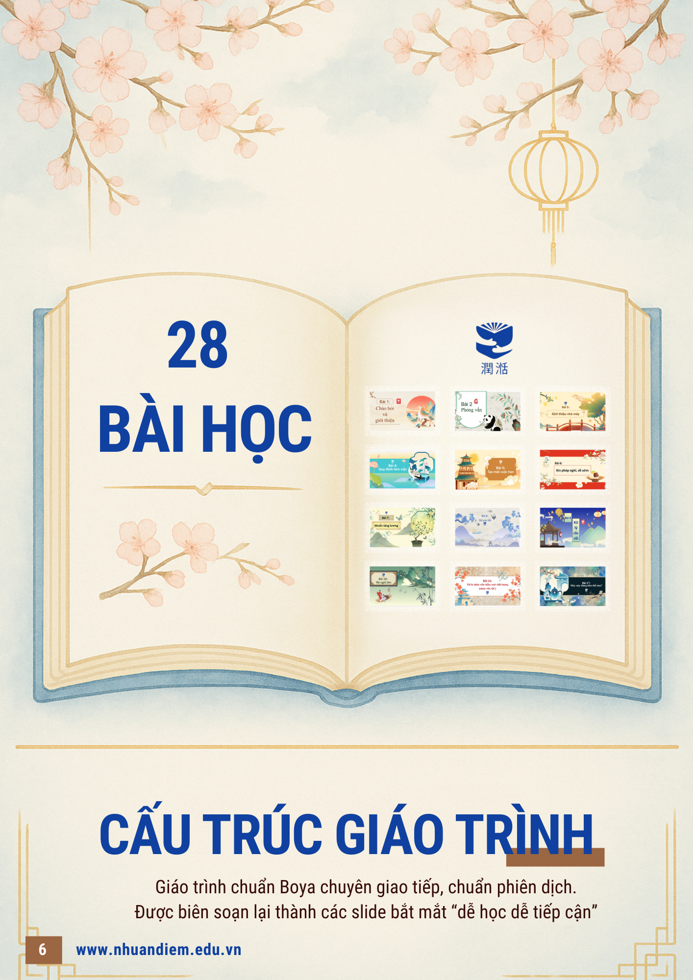 Trên trang 6 và 7 của tài liệu, Nhuận Điềm giới thiệu 28 bài học chuyên biệt, được biên soạn lại từ giáo trình Boya chuẩn giao tiếp – chuẩn phiên dịch và thiết kế lại theo hướng “học để dùng thật”.